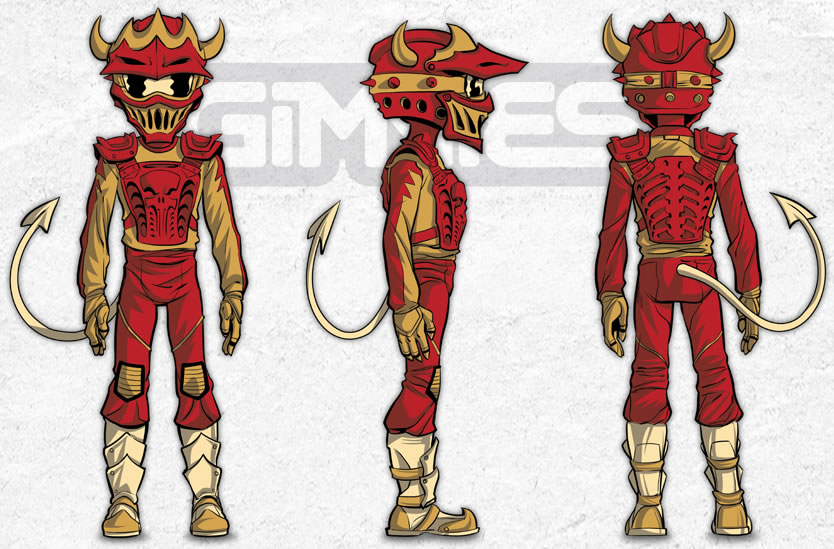 Dark. Silent. Mysterious. Steeze is a kind of po-mo version of a medieval knight but his only allegiance is to the Gimmies and he answers to no one, not even Uncle G. Unlike many of the other hyperactive Gimmies, Steeze gives the impression of being older, wiser and yet he never ever speaks. Body language is everything with him: read it wrong and you’ll wish you didn’t. Some might call him “devilishly handsome” yet seeing as his helmet and goggles stay on even when he’s eating BBQ, submerged in sewage, or sleeping, nobody really knows. Half the Gimmies think Steeze hates them; the other half just really hope he doesn’t.